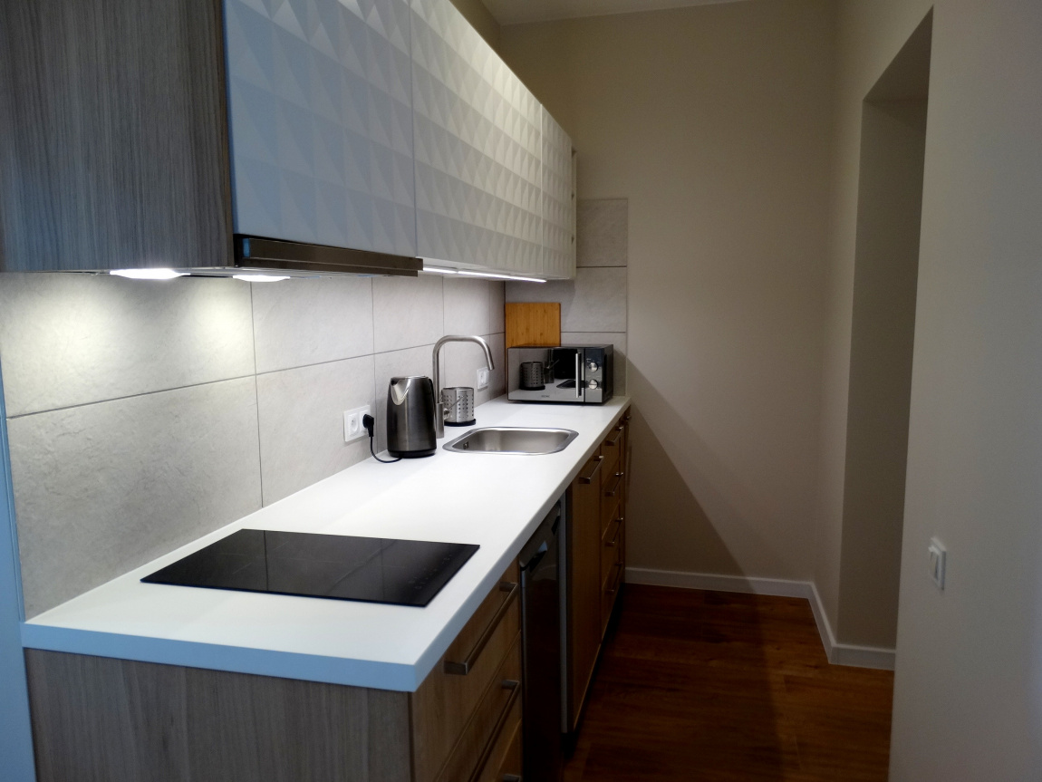 W apartamencie znajduje się również aneks kuchenny w pełni wyposażony w niezbędne urządzenia AGD: kuchenkę, mikrofalówkę, lodówkę, bezprzewodowy czajnik elektryczny.