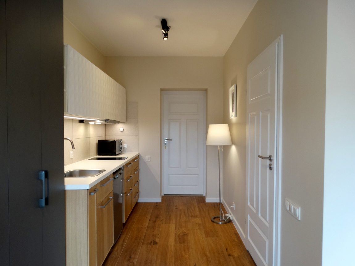 W apartamencie znajduje się również aneks kuchenny w pełni wyposażony w niezbędne urządzenia AGD: kuchenkę, mikrofalówkę, lodówkę, bezprzewodowy czajnik elektryczny.